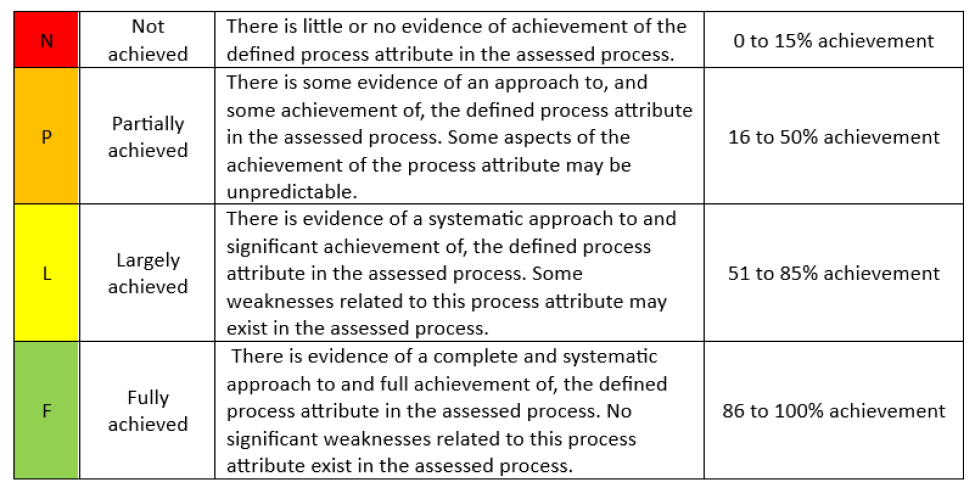 To achieve capability level 2, you need to achieve a score of F on the previous level (PA1.1) and at least L or F in the newly introduced PA2.X points attached to it. The same logic applies to achieving levels 3, 4, and 5.