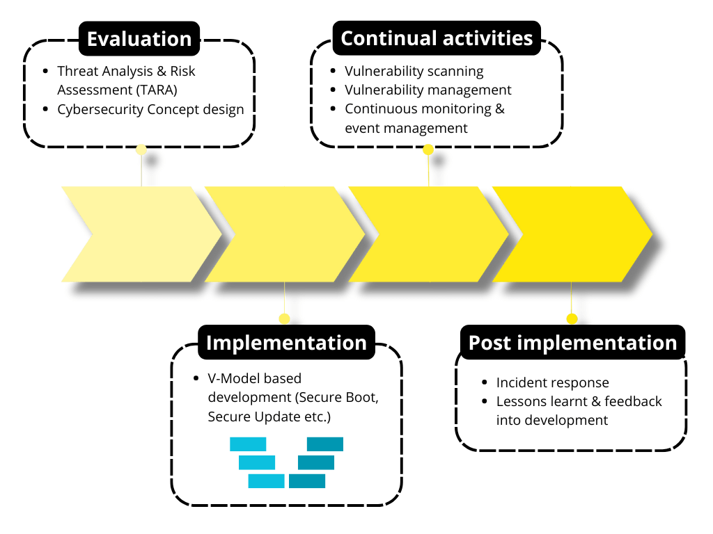 Automotive cybersecurity is a constant cycle of anticipating threats, building defences, and responding to incidents. It starts with TARA to identify where the highest risks are, from infotainment systems to safety-critical controls, guiding design priorities. Engineers then implement measures such as: